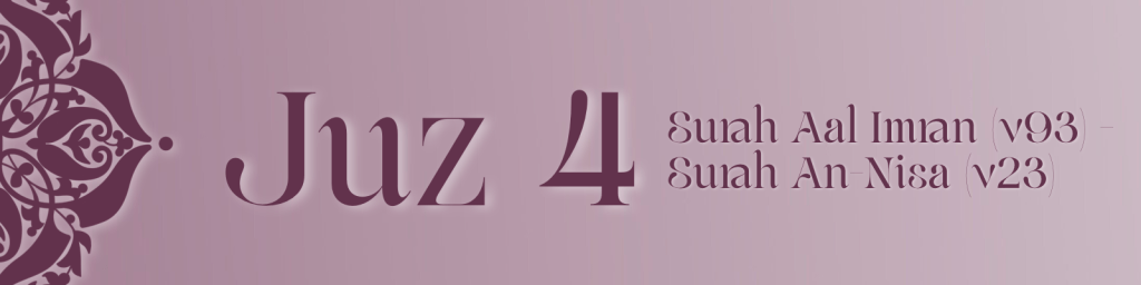 Juz 4 continues through Surah Al Imran and opens Surah an Nisa, linking spiritual resilience with social responsibility. Through the lessons of the Battle of Uhud, it reminds believers that hardship and victory are both part of Allah’s wisdom, and that true strength lies in obedience, patience and unity.