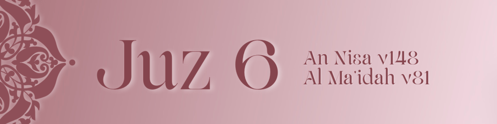 Juz 6 completes Surah an-Nisa and opens Surah al-Ma’idah, showing the Qur’an as a perfectly connected and balanced message, where each passage supports the next. It highlights the protection of society through justice, including the prohibition of spreading harm unless it is to stop oppression, and stresses the importance of Allah’s inheritance laws in preserving fairness and social stability.