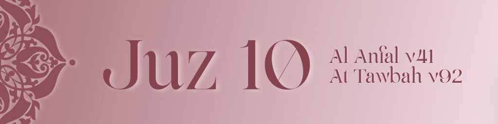 Juz 10 continues through Surah Al Anfal and moves into Surah At Tawbah, laying down clear principles for justice, loyalty and accountability within the growing Muslim community. It refines the ethics of warfare, clarifies the ruling on captives and shows how divine revelation resolves differences and establishes balance between mercy and firmness.