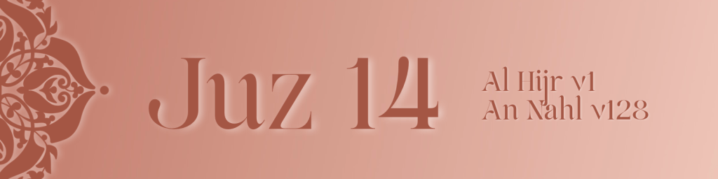 Juz 14 reflects on divine protection and human responsibility. It affirms the miraculous preservation of the Qur’an, showing that revelation is guarded by Allah beyond human interference. Signs within creation, from the guarded heavens to the winds that carry rain, point to a Lord who sustains and defends His decree.