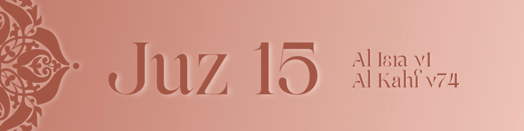 Juz 15 centres on the Night Journey and Ascension, revealed during a time of deep grief for the Prophet. It recounts his sacred journey from Makkah to Jerusalem and through the heavens, where he met the earlier prophets and led them in prayer, affirming his rank among the messengers.