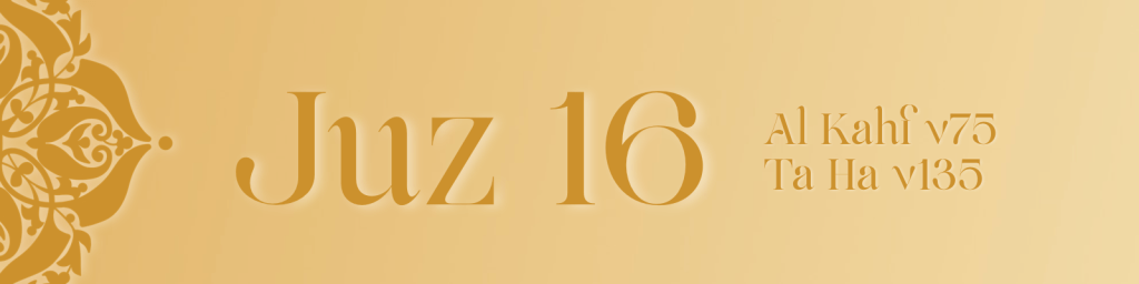 Juz 16 continues through Surah Al Kahf, Surah Maryam and into Surah Ta Ha, drawing attention to the mercy of Allah in the lives of His chosen servants. It recounts the devotion of Maryam, the miraculous birth of Isa and the tender dialogue between prophets and their Lord.