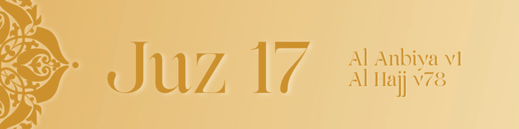 Juz 17 continues through Surah Al Anbiya and into Surah Al Hajj, highlighting the unity of the prophetic message across time. It recounts the trials of many prophets, including Ibrahim, Lut, Ayyub and Yunus, showing how patience, trust and sincere devotion lead to Allah’s mercy and deliverance.