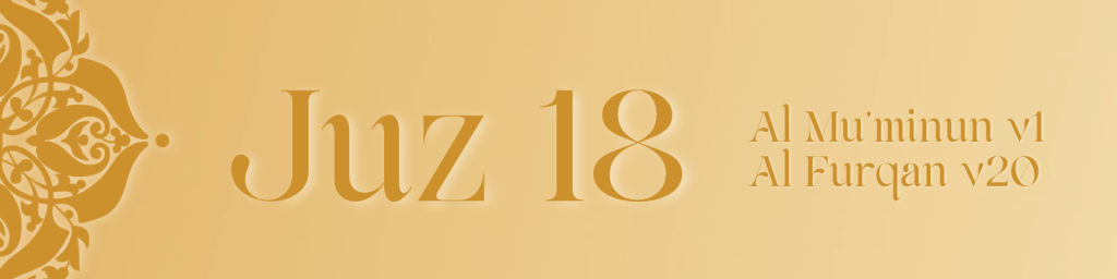 Juz 18 begins with Surah Al Mu’minun, defining true success through the qualities of sincere believers, humility in prayer, turning away from vain speech and guarding trust and integrity. It teaches that faith is lived through character, discipline and devotion rather than worldly status.