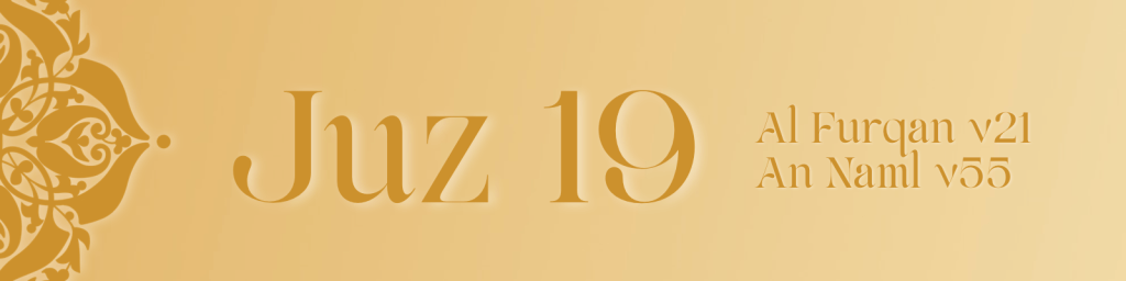 Juz 19 moves through Surah Al Furqan, Surah Ash Shu‘ara and Surah An Naml, contrasting the arrogance of those who reject revelation with the humility of the servants of the Most Merciful. It outlines the qualities of sincere believers, including devotion, restraint and sincerity in worship.