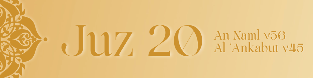 Juz 20 continues through Surah An Naml, Surah Al Qasas and into Surah Al Ankabut, highlighting Allah’s response to the desperate call of the mudtar, the one who turns to Him after exhausting all worldly means. It recounts the exile of Musa and his journey to Madyan, showing how trust in Allah guides the believer through uncertainty.