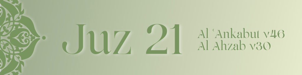 Juz 21 continues through Surah Al Ankabut, Surah Ar Rum, Surah Luqman and Surah As Sajdah, reflecting on the purpose of this world and the signs of Allah throughout creation. It recalls the prophecy of the Roman victory and encourages believers to engage others with wisdom and the best manner of dialogue.