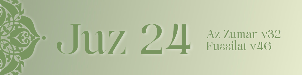 Juz 24 continues through Surah Az Zumar, Surah Ghafir and Surah Fussilat, emphasising the majesty of the Qur’an and the vast mercy of Allah. It highlights the treasury of tawbah, reminding believers that forgiveness remains open to all who return before the final moment of death.