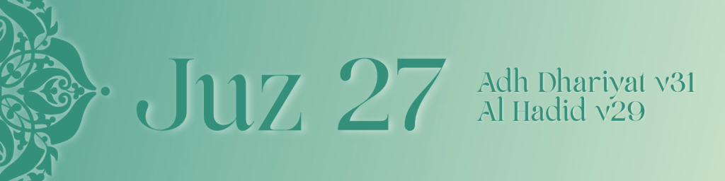 Juz 27 moves through a series of powerful Makkan surahs that call the heart to reflect on Allah’s signs and the certainty of the Hereafter. It contrasts the quiet devotion of the righteous with the repeated denial of past nations, reminding humanity that every soul will stand accountable for its deeds.