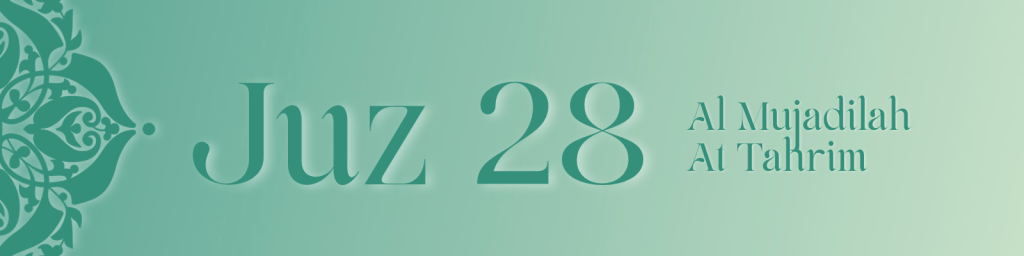 Juz 28 centres on faith lived through family, community and personal integrity, repeatedly addressing the believers with “O you who believe.” It establishes social and moral guidance, from justice within marriage and divorce to the etiquette of gatherings and the responsibility of loyalty to the believing community.