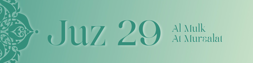 Juz 29 contains many of the short Makkan surahs that focus on the foundations of faith. They call the heart to recognise the truth of revelation, the certainty of resurrection and the inevitability of standing before Allah.